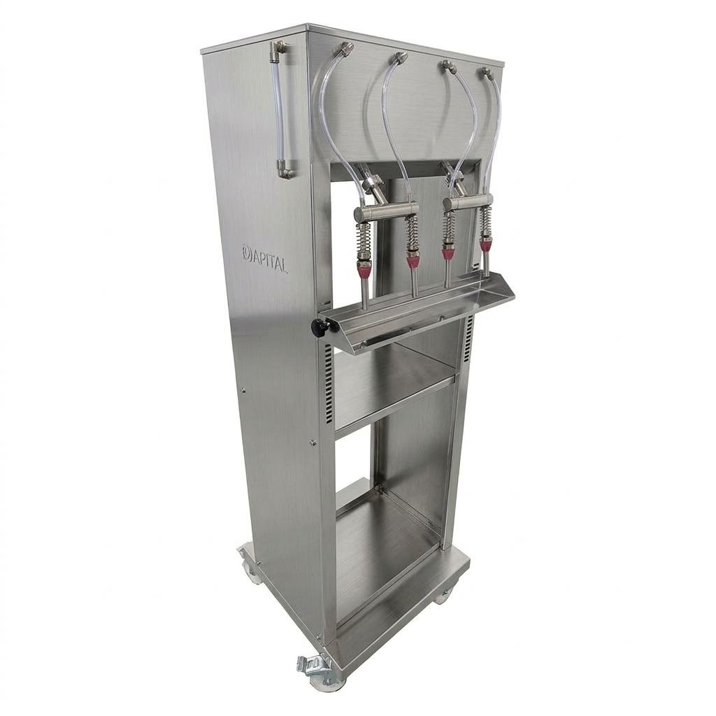 Pruža pouzdano i efikasno rješenje za punjenje tekućina u različite vrste boca. Izrađena od visokokvalitetnog nehrđajućeg čelika, osigurava dugovječnost i lako održavanje. Nivokaz omogućava precizno praćenje razine tekućine, dok mogućnost priključka pumpe čini punjenje još bržim i jednostavnijim. S funkcijom regulacije visine punjenja moguća je prilagodba uređaja različitim veličinama boca.